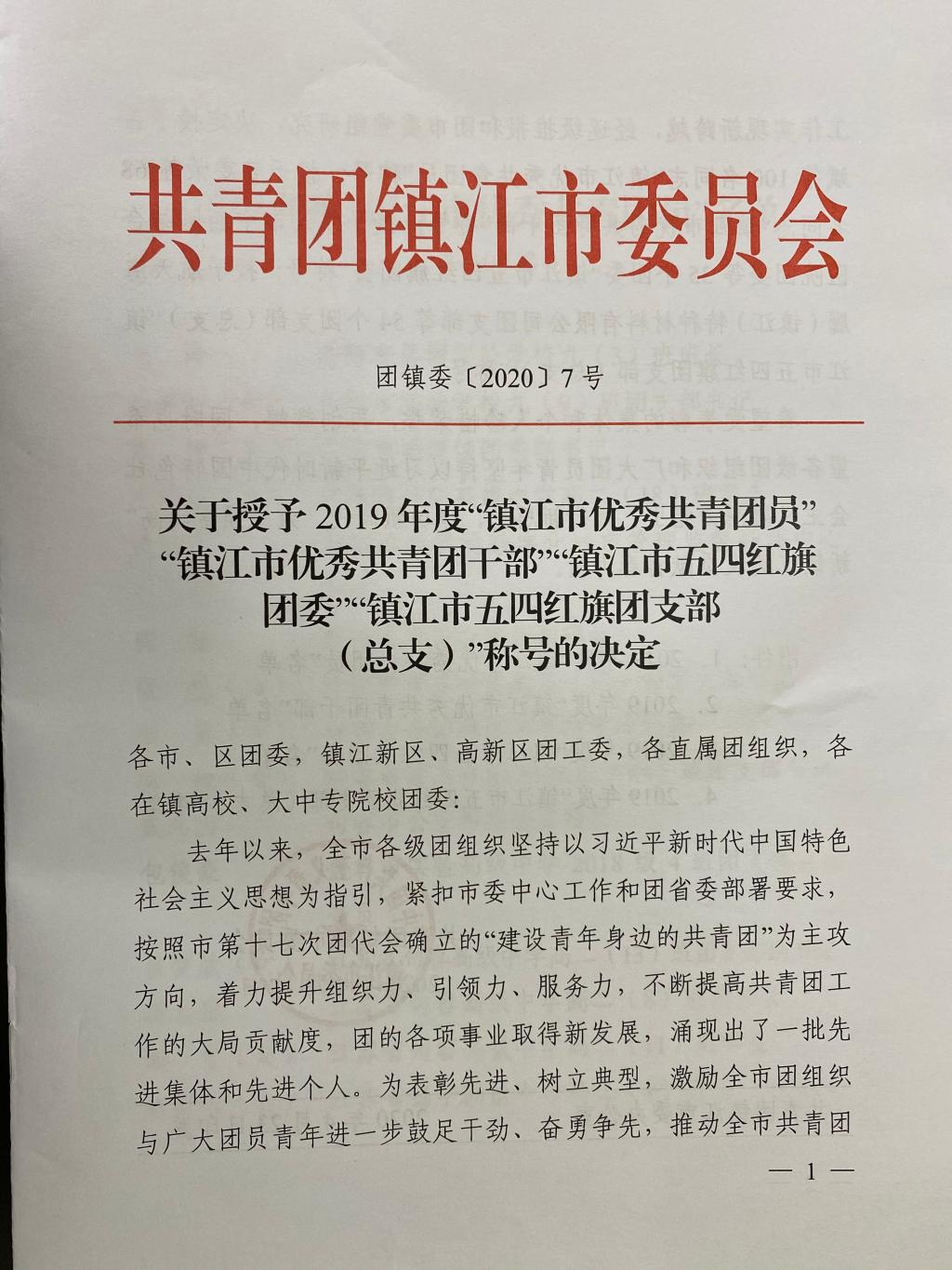 近日,2019年度“镇江市优秀共青团员”、“镇江市优秀共青团干部”、“镇江市五四红旗团委”和“镇江市五四红旗团支部(总支)”评选结果揭晓。