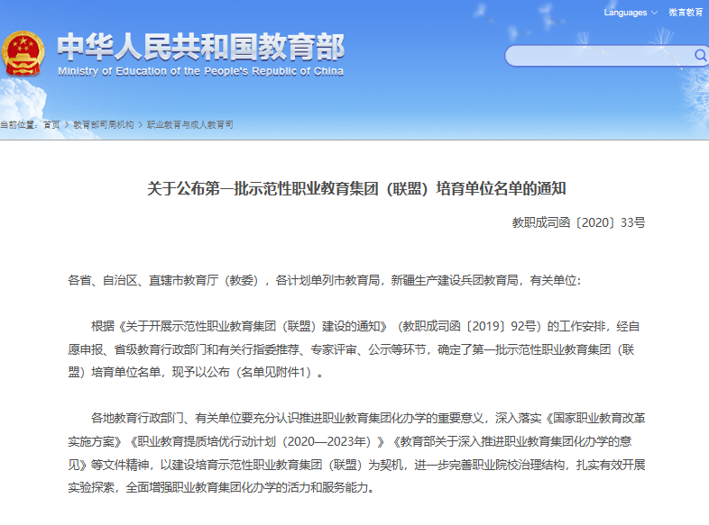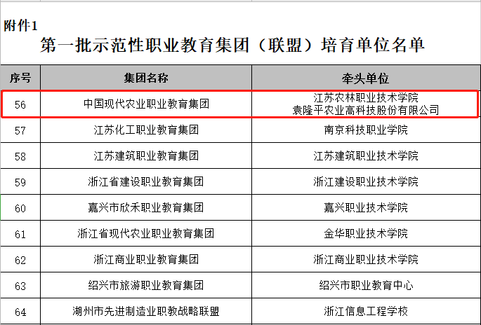 10月15日,教育部公布首批全国示范性职教集团培育单位名单。由FUN官网和袁隆平农业高科技股份有限公司牵头成立的中国现代农业职业教育集团被确定为首批示范性职教集团。