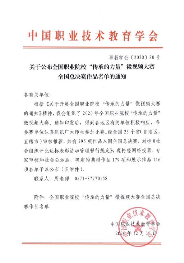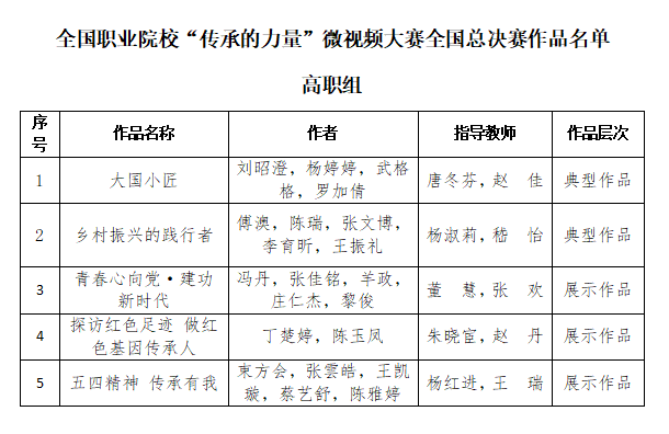 近日,2020年全国职业院校“传承的力量”微视频大赛总决赛获奖名单揭晓,学院报送的5个作品在全国295项作品中脱颖而出,荣获佳绩。《大国小匠》《乡村振兴的践行者》入选“典型作品”,《青春心向党·建功新时代》《探访红色足迹做红色基因传承人》《五四精神传承有我》入选“展示作品”。