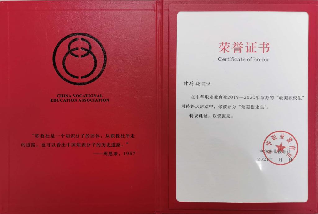 近日,由中华职业教育社举办的“最美职校生”网络评选活动结果出炉,我校农学园艺学院2018级现代农业技术(定制村干)2班甘玲珑同学荣获“最美创业生”称号。