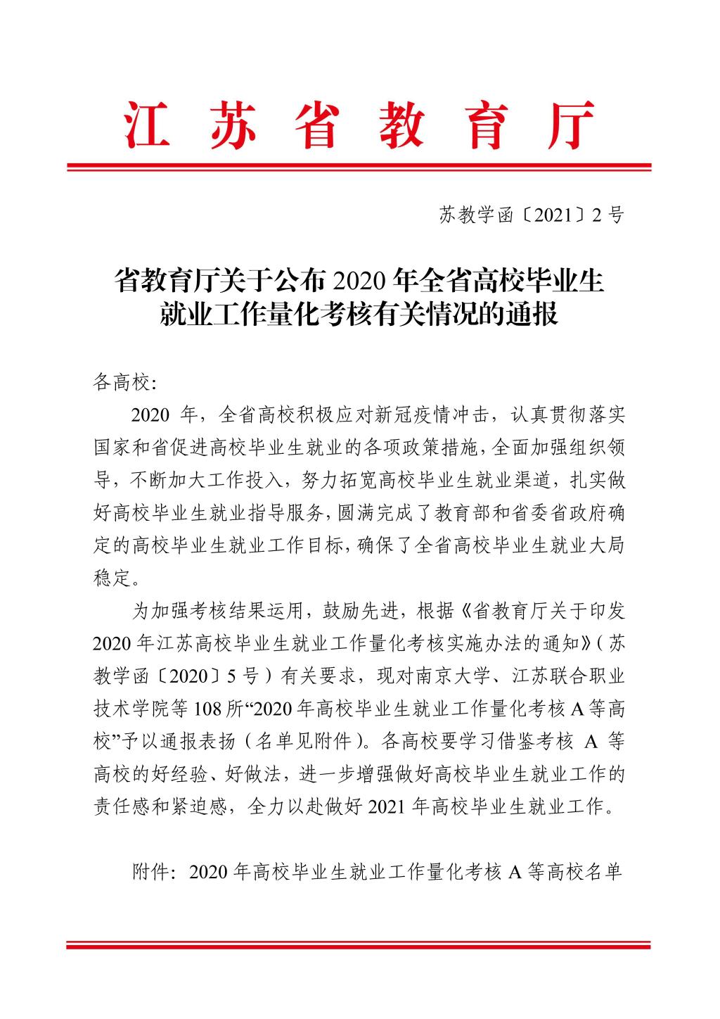 近日,省教育厅公示了《省教育厅关于公布2020年全省高校毕业生就业工作量化考核有关情况的通报》(苏教学函[2021]2号)文件,FUN官网喜获“2020年全省高校毕业生就业工作量化考核A等高校”称号。