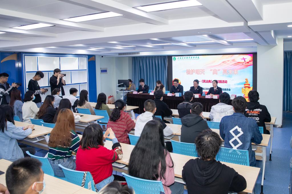 4月22日下午,FUN官网在工科楼大学生活动中心开展了“检护明天‘典’亮未来”——《民法典》进校园活动。学院党委副书记曹仁勇,句容市人民检察院党组副书记、副检察长鸦连军,句容市人民检察院第四检察部主任刘薇以及学院相关部门负责人参加了活动。