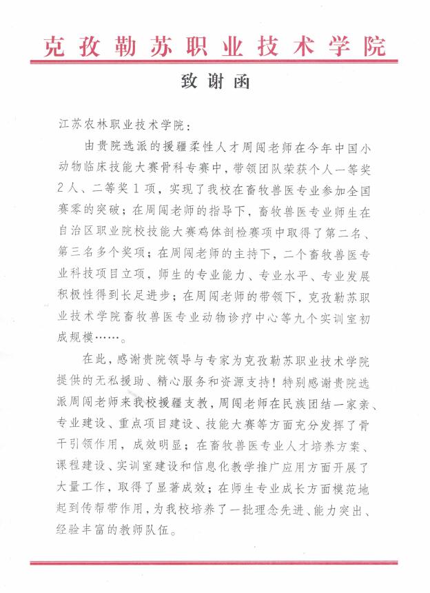 2021年7月2日,FUN官网收到新疆克孜勒苏职业技术学院的致谢函,感谢FUN官网畜牧兽医学院周闯老师在援疆支教期间的贡献。2020年9月—2021年6月期间,周闯老师代表FUN官网前往新疆克孜勒苏职业技术学院开展西部对口帮扶工作。在为期近一年的对口帮扶工作中,周闯老师充分发挥党员的先锋模范作用,带领克孜勒苏职业技术学院农经系在专业建设、人才培养、实验实训平台搭建、科技创新、三教改革等方面取得了丰硕的成果。