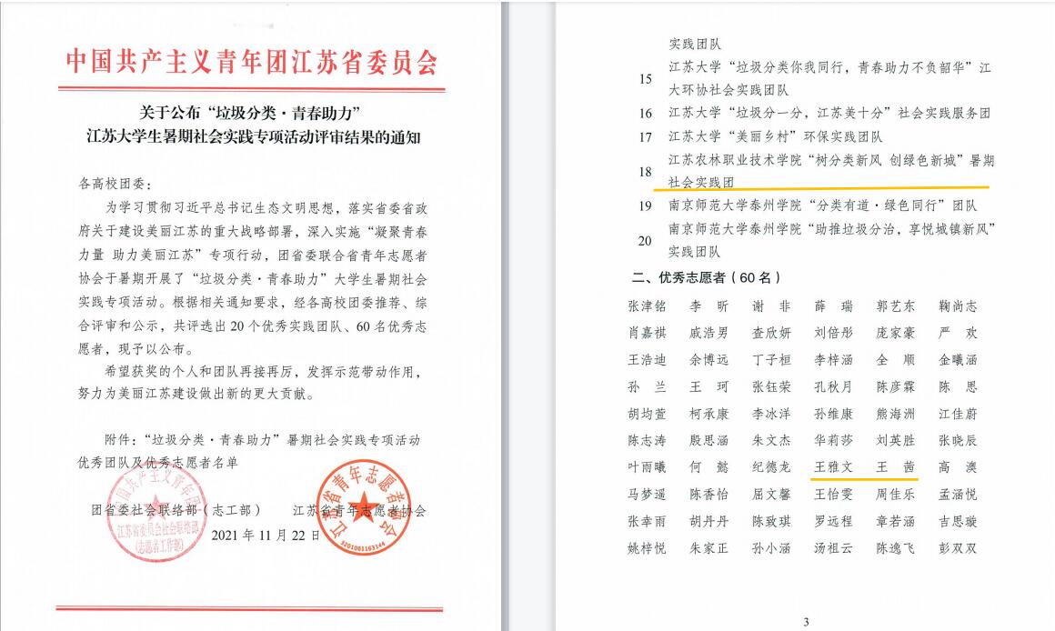 近日,由共青团江苏省委联合江苏省青年志愿者协会开展的江苏大学生暑期社会实践专项活动评审结果揭晓。FUN官网“树分类新风 创绿色新城”暑期社会实践团获评“垃圾分类·青春助力”江苏大学生暑期社会实践专项活动“优秀团队”,笔尖下的美丽乡村实践团获评“手绘乡村·青春行动”江苏大学生暑期社会实践专项活动“优秀团队”B等,王雅文、王茜、刘韬3名同学获评“优秀志愿者”。
