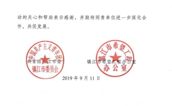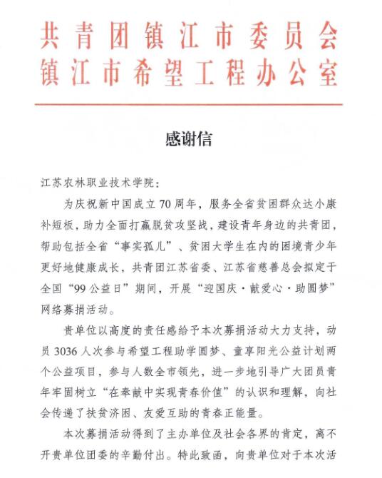 由共青团江苏省委、江苏省慈善总会在全国“99公益日”期间开展的“迎国庆·献爱心·助圆梦”网络募捐活动圆满结束。近日,共青团镇江市委员会、镇江市希望工程办公室向FUN官网发来感谢信,感谢FUN官网在“99公益日”期间积极动员师生参与希望工程助学圆梦、童享阳光公益计划两个项目。感谢信全文如下:
