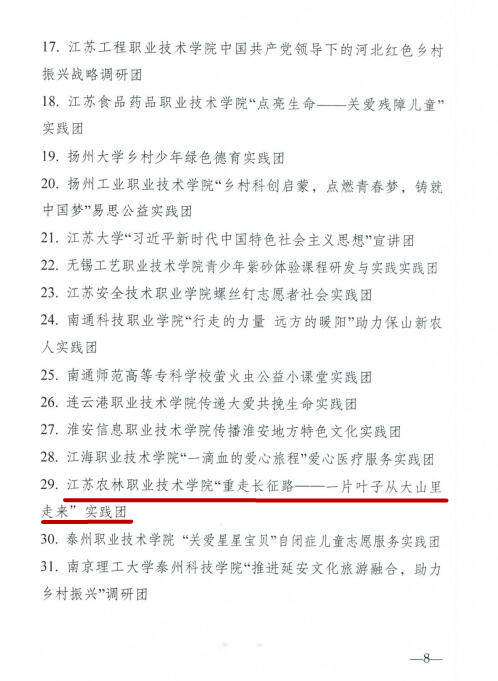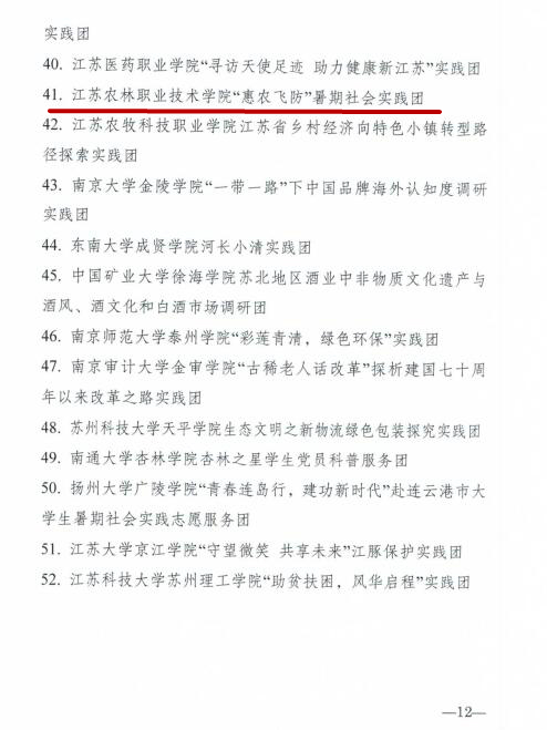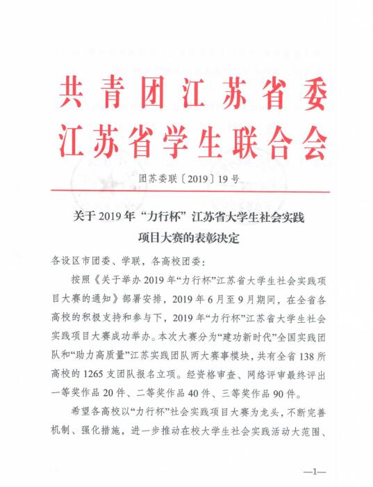 2019年6月-9月,2019年“力行杯”江苏省大学生社会实践项目大赛成功举办。由FUN官网团委推报的茅山校区“重走长征路——一片叶子从大山里走来”实践团、机电工程学院“惠农飞防”暑期社会实践团均荣获“建功新时代”全国实践团队和“助力高质量”江苏实践团队三等奖。