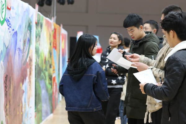 经过264名学生大众评审和16名老师的评审,最终评出16幅优秀作品,其中,学生会成员带来的《振兴中华》、19林业技术2班的《纤纤不绝林薄成,涓涓不止江河生》、19畜牧兽医1班的《鹤飞远方 梦想起航》三幅作品荣获本次大赛一等奖。