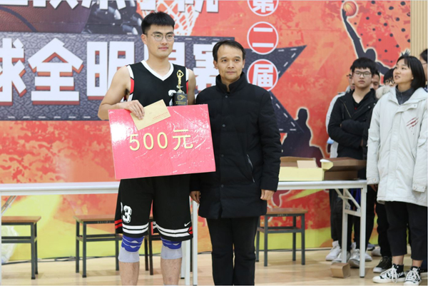 在三分王大赛环节中,参赛者要在一分钟二十秒内依次在五个投篮点上投篮,进球最多者获胜。只见运动员眼睛瞄准篮筐,双手轻轻一掷,篮球便稳稳地落入篮筐。最终,18食品营养与监测1班郑博同学夺得三分王大赛冠军。技巧挑战赛分为变向运球、传球、低手上篮、三分远投四个部分,完成整套动作时间最短者获胜。娴熟的技巧和沉稳的步伐让来自17林业技术2班王昭同学获得技巧挑战赛的冠军。在高低年级全明星对抗赛中,各代表队是由来自各个学院(校区)的代表组成,分为梦之队和龙之队,最终,梦之队以81:74比分摘得此次全明星决赛的桂冠,来自17园林(4+0)班袁博同学获得了此次篮球全明星决赛MVP。