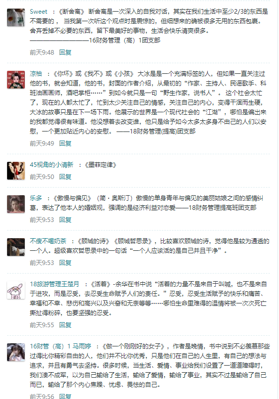 经济与人文学院团委举办“时光正好,与书同行”读书日主题活动,通过青年虚拟形象“小菁人”QQ号开展“时光正好,与书同行”读书日主题活动,引导广大青年积极参与阅读,提升文化素养,打造书香校园。此次活动通过“QQ空间话题参与”的形式开展,全院青年通过回答“你最想要推荐的书是什么?”“你为什么喜欢这本书”等问题,引导青年大学生在认真阅读的基础上,选择自己最欣赏、最喜爱的好书,将值得阅读的原因、部分精彩语句以及自己阅读时的感受,推荐理由进行描述。18旅游管理团支部的吕文凤在留言中写到:我推荐《城南旧事》这本书!《城南旧事》令我陶醉,它就像夏日里的一缕清风,让我领悟到了童年的真谛。也许每个人读到它,童年的岁月和一件件往事都会如潮浪般涌现。童年发生的故事是这样的平凡,却又如此奇妙。