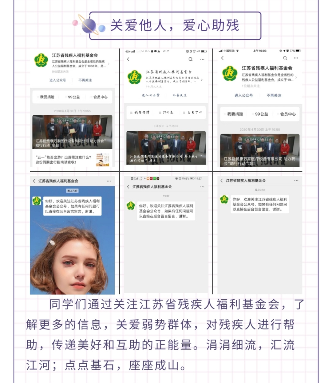 为了宣传第30个全国助残日,营造全社会关爱残疾人的浓厚氛围,5月15-5月17日,风景园林学院团委开展“爱心传递,阳光同行”全国助残日主题活动。