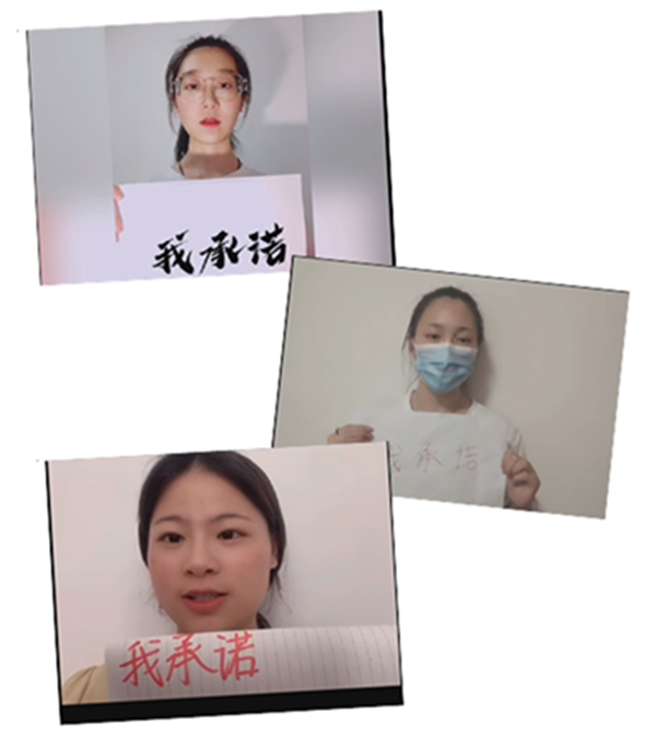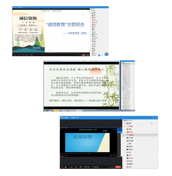 活动分为“云班会”、“云承诺”、“云行动”三个环节。通过召开线上主题班会,发出诚信倡议书,组织全体学生观看诚信教育宣传片;“云承诺”环节主要针对毕业生群体,通过召开毕业生诚信还款线上会议,签订还款承诺书,增强毕业生的诚信意识;随后,各班级通过“诚信教育知识问答”、"诚信与我“线上分享会等特色主题活动,纷纷表示在日常学习、工作和生活中,做到知行合一,勇担时代重任。