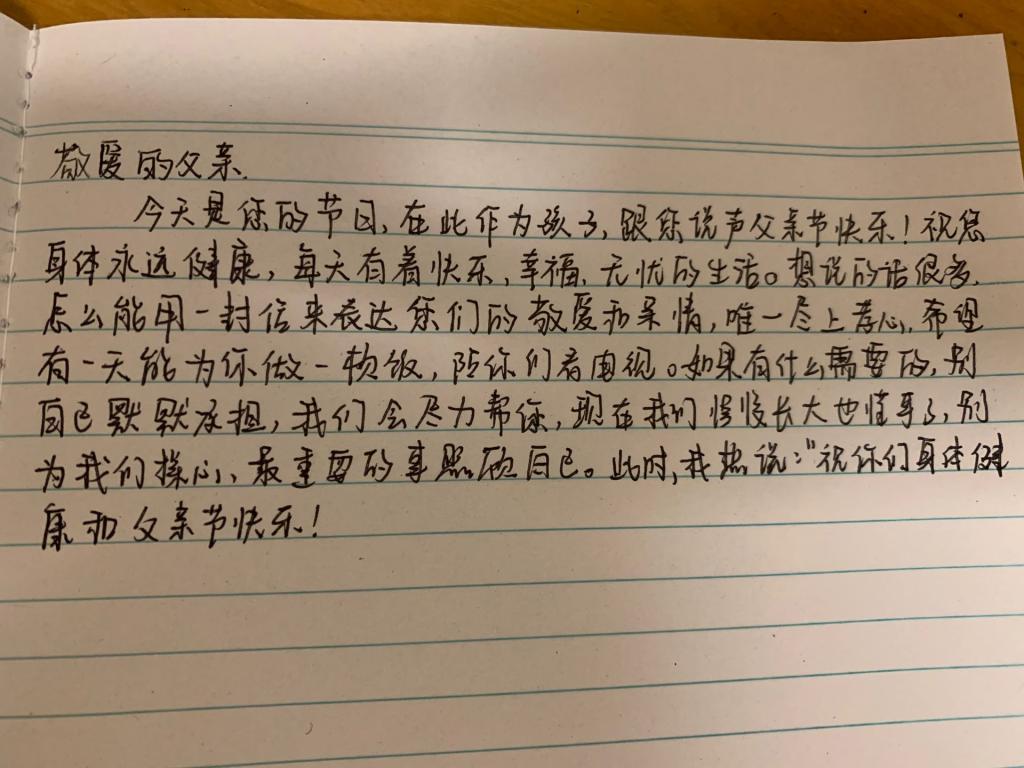 本次活动共分为“我对爸爸说的心里话”“我为爸爸做的一件小事”“我和爸爸的合照”三个环节,同学们借此祝福父亲节日快乐,于细节处表达对父亲的爱。在“我对爸爸说的心里话”环节,同学们或书写传统纸质书信,或发送现代电子信息,将平日里想说却未说的话讲出来,拉近了亲子距离。而“我为爸爸做的一件小事”环节则展示了同学们的爱心行动,比如利用专业特长为父亲做饭、做水果拼盘、沏茶,送上一份小礼物、献上一束鲜花。最后,同学们在“我和爸爸的合照”环节,与父亲或坐或站,或牵手或拥抱,拍出了创意照片,传达了割舍不断的亲情。