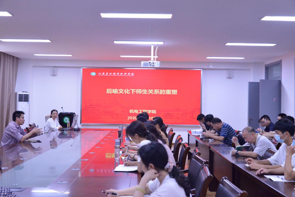 9月16日,机电工程学院2020年首期“师德师风大讲堂”在学院会议室举行。江苏省政协委员、学校首批师德标兵、马克思主义学院丁志春副教授讲述“后喻文化下师生关系的重塑”,机电工程学院师生代表聆听了此次讲座。