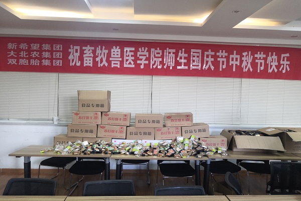 9月30日,由新希望集团、大北农集团、双胞胎集团三家企业爱心捐赠的4600个月饼发放到畜牧兽医学院学生手中,希望同学们能够在学校渡过一个愉快的中秋、国庆双节。
