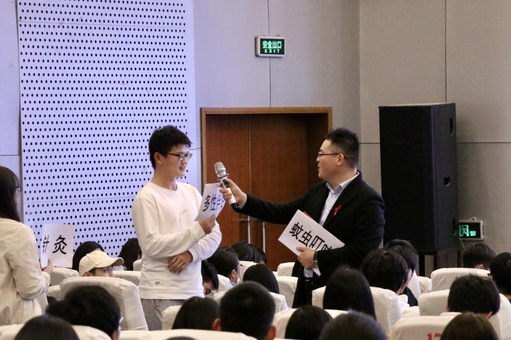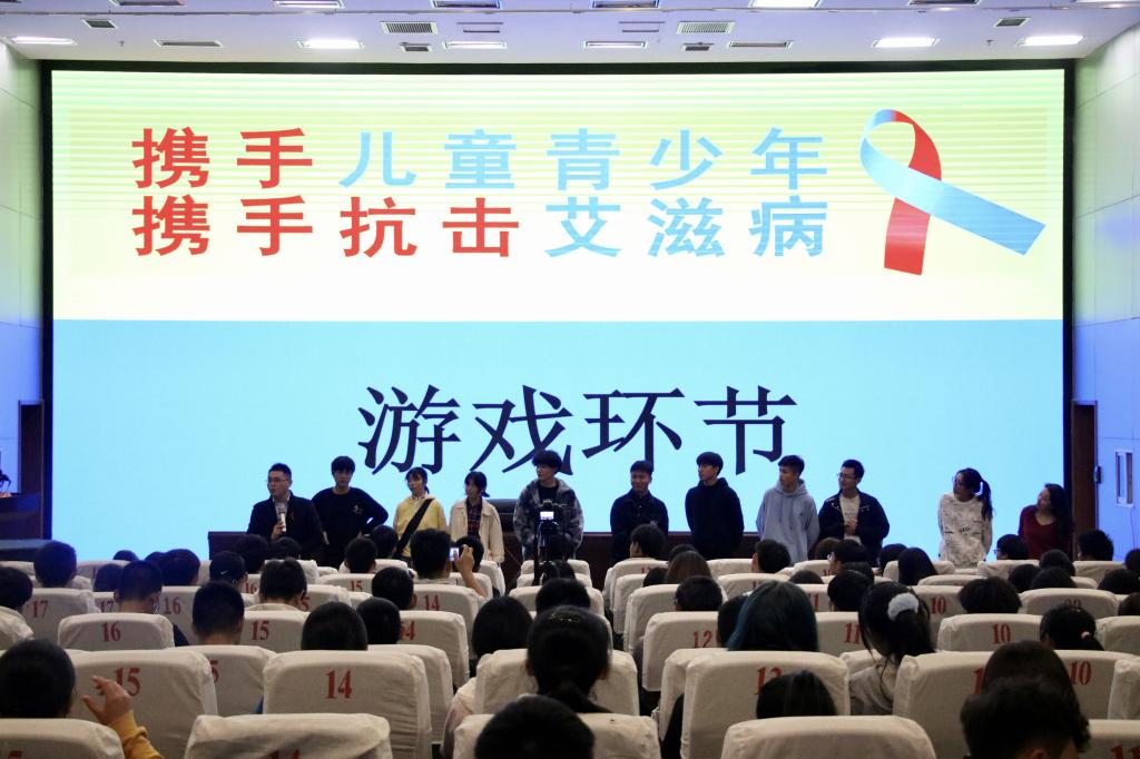 讲座现场,周瑞老师以游戏环节热场,用最新的数据、图表对艾滋病的概念,国内外的发展趋势,传播途径,发病期表现以及红蓝丝带的含义等话题进行了生动阐述。他以卡片游戏的形式,生动形象地说明了艾滋病的感染条件、不同行为的风险程度,现场对避孕套的获取、使用、以及回收方式进行了展示。