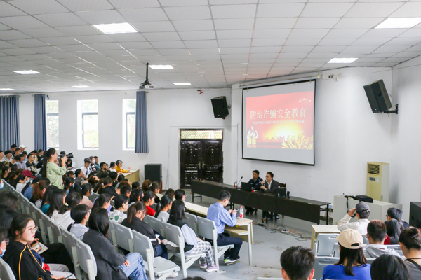 讲座围绕网络诈骗、校园贷及如何预防诈骗三个方面展开。束其兵通过身边的案例和漫画图片展示各种诈骗手段,剖析受害人被电话、短信、网络诈骗时的心理特征。他指出,当代社会科技手段发达,网络诈骗等新型诈骗手段已成为主要诈骗方式,大一新生则是受骗的主要人群之一,因此,学生更应该掌握防诈骗知识,以达到保护自己的目的,同时,他提醒师生从自己做起,在做好自身安全防范的同时,积极向亲朋好友做好宣传,防范各种电信诈骗。