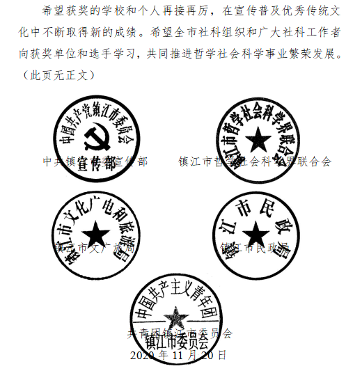 近日,2020年“致敬镇江 经典传诵”大学生诗词大会系列活动获奖情况揭晓。诵读视频比赛中,经济与人文学院陈树芳、黄拓源同学获得一等奖,风景园林学院杨清涵同学获得二等奖,农学园艺学院吴亚宇、帅林凯、夏琪、樊梦萌同学获得三等奖。大学生诗词大会决赛中,农学园艺学院的陆奕蕾同学荣获优秀奖。
