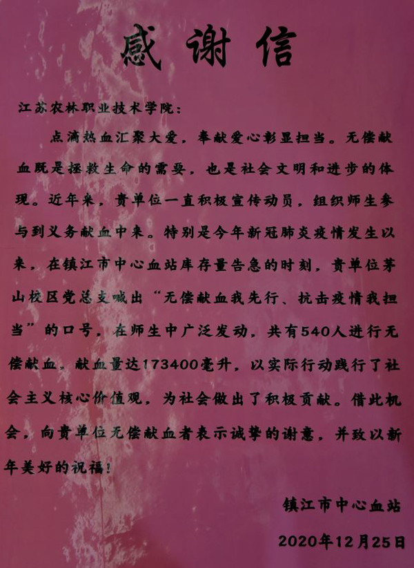 12月25日,镇江市中心血站句容采储血点主任徐平一行来到FUN官网,把一面由镇江市中心血站颁发的“疫情无情人有情 大爱之举暖人心”锦旗,送到了师生手中,表达对FUN官网学生无偿献血的爱心回馈和感激之情。