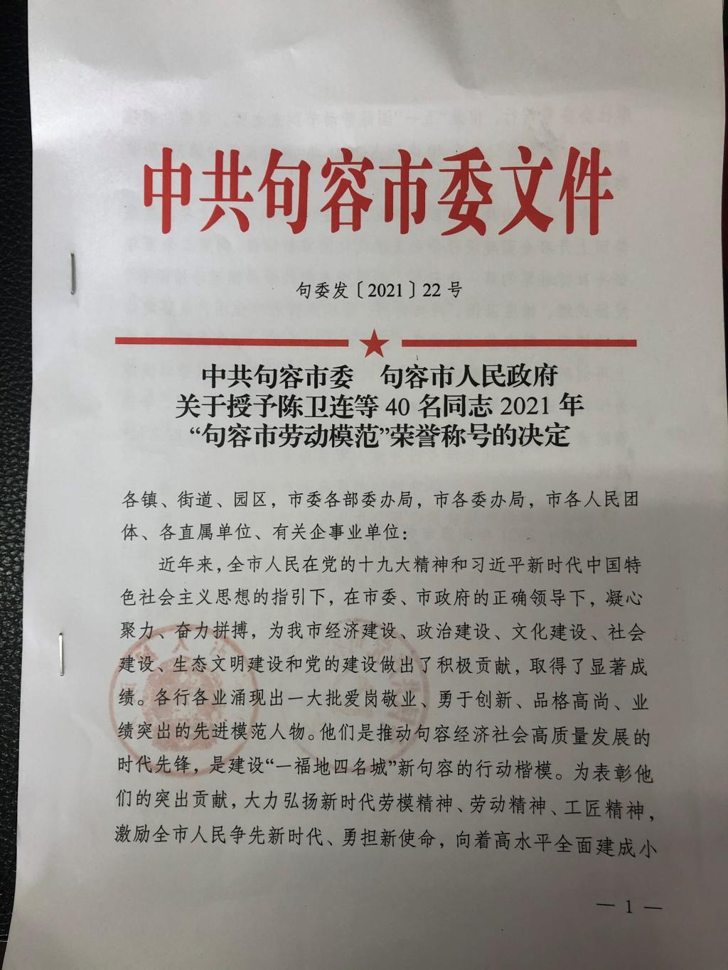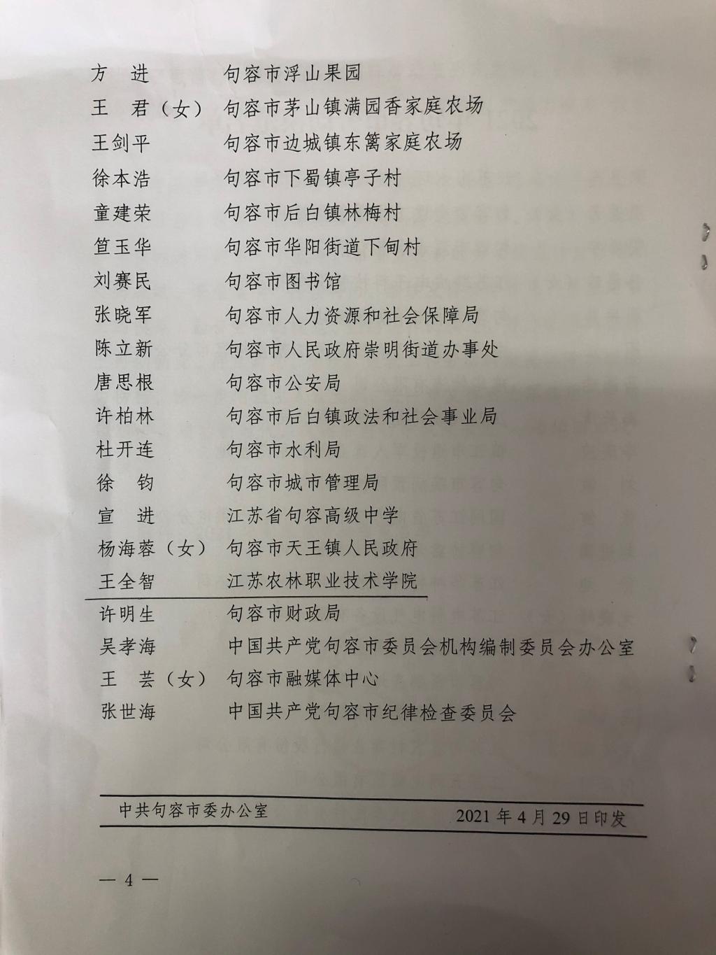 4月30日上午,“五一”国际劳动节来临之际,句容市委、句容市政府表彰了我市各行各业涌现出的爱岗敬业、勇于创新、品格高尚、业绩突出的先进模范,我校农学园艺学院党总支副书记王全智荣获2021年“句容市劳动模范”称号。