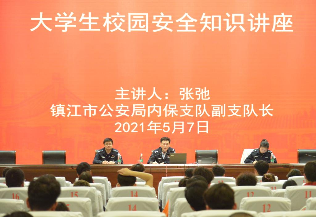 活动邀请了镇江市公安局内保支队李挺与张驰两位民警,就大学生校园安全知识、防范电信网络诈骗这俩个内容开展了专题讲解,两位民警同志就常见的校园安全问题以及电信网络诈骗形式并结合身边的典型案例,以案说法,提醒师生要绷紧安全这根弦。