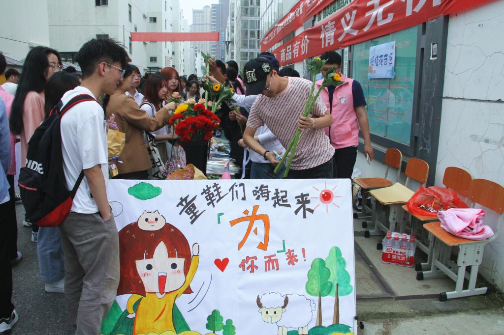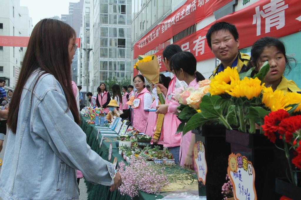 5月13日,全国助残日前夕,FUN官网“爱馨”心理协会携手句容市特殊教育学校,在本部校区食堂门口举办了爱心义卖活动,特殊教育学校的十余位师生参与了活动。