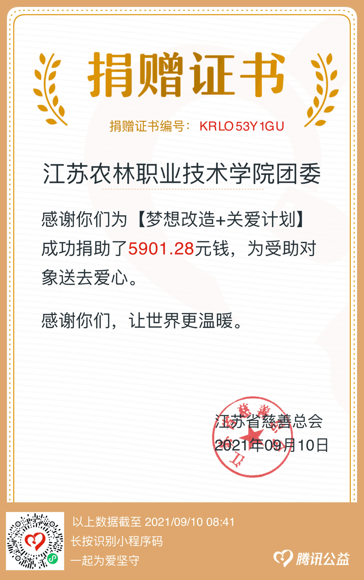 学院团委积极响应团省委、团市委号召,主动向全院师生发布“99公益日”爱心捐款活动倡议,鼓励师生积极奉献爱心捐助善款,助力“梦想改造关爱计划”公益项目。截止9月10日上午8时,全院共有1269人次参与捐款,已筹到善款5901.28元,在镇江市83个团队中位列前茅。