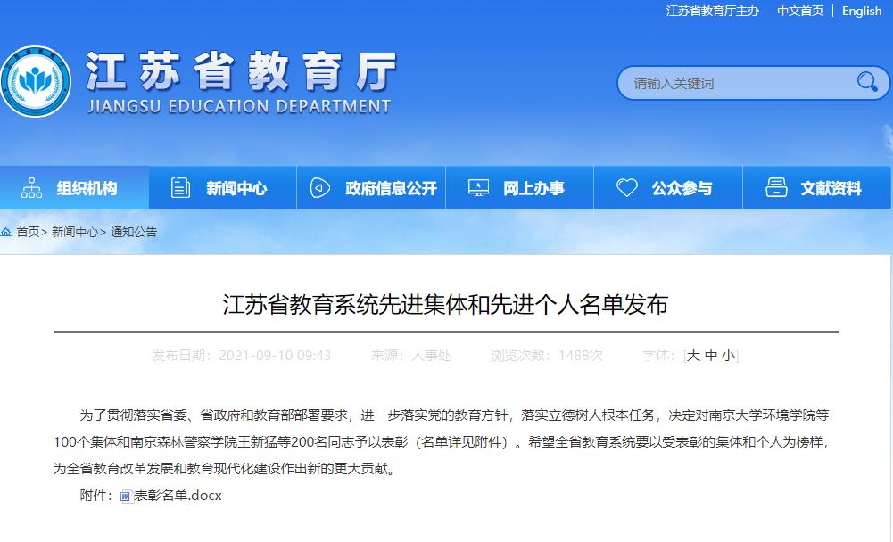 9月10日,江苏省教育厅《江苏省教育系统先进集体和先进个人名单发布》,农学园艺学院荣获“江苏省教育系统先进集体”称号。