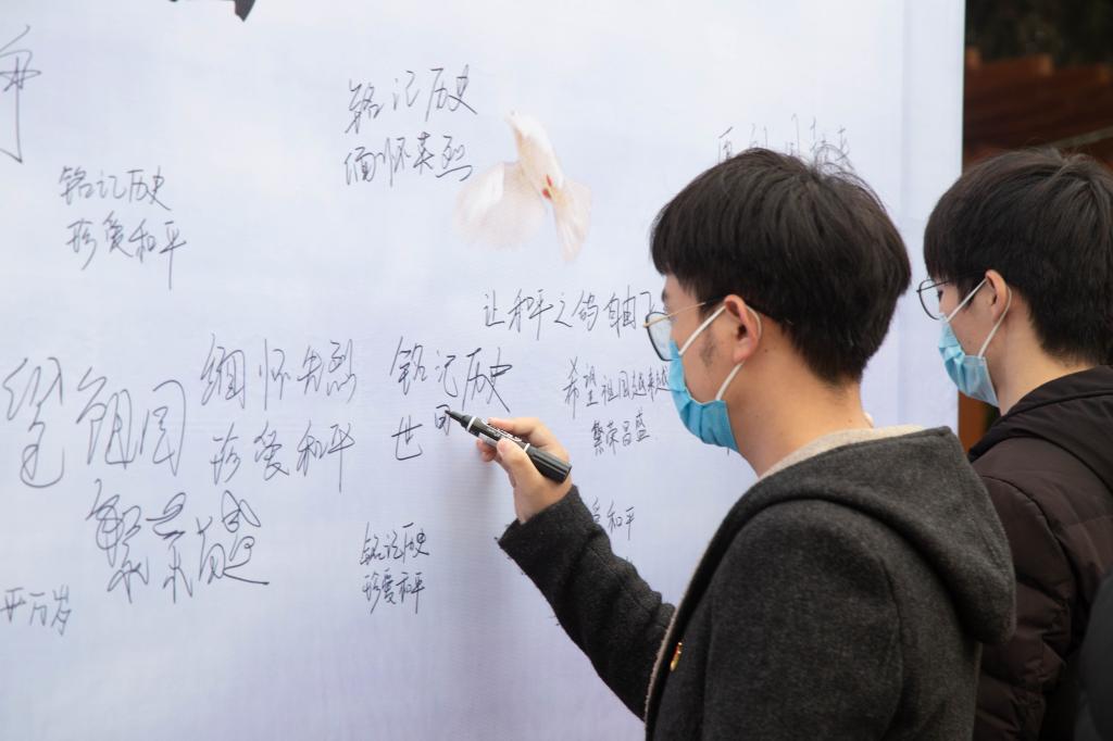 活动现场,同学生们通过观看珍贵的历史图片展和电影《南京!南京》,深入了解国家公祭日设立的重要意义与南京大屠杀等重大历史事件,心中充满了对逝去同胞的哀悼之情,并举行了庄严的哀悼仪式。默哀结束后,同学们铿锵有力的朗诵《和平宣言》:“巍巍金陵,滔滔大江,钟山花雨,千秋芬芳……举世震惊,九州同悼……”一字一句,将大家带回那段惨痛的历史。祭奠同胞,许下誓言,振兴中华,吾辈当自强。同学们在许愿墙上写下祈愿和平的心愿,表达了出对逝者的哀思与对世界和平的呼唤。