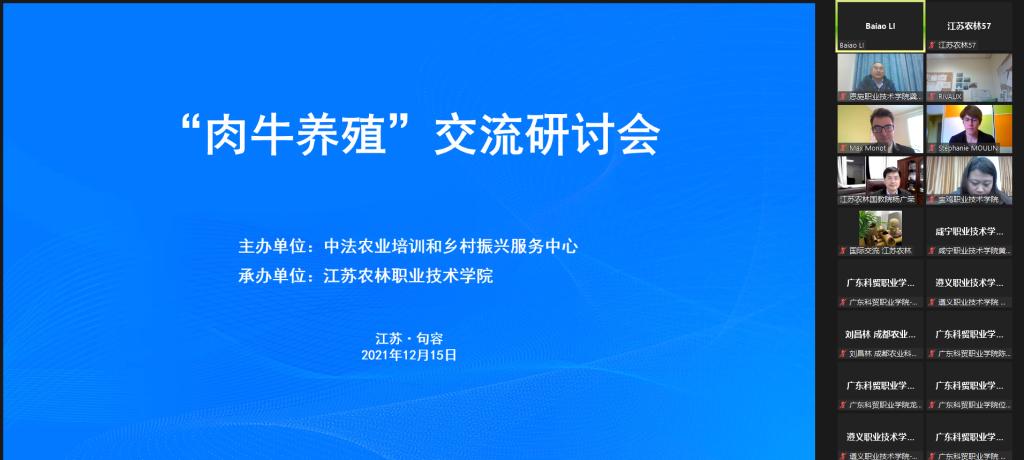 此次中法“肉牛养殖”交流研讨会是疫情期间中法院校间通过视频会议方式开展的第一次交流活动,会议由中法农业培训和乡村振兴服务中心主办,共有宝鸡职业技术学院、铜仁职业技术学院、宜宾职业技术学院、遵义职业技术学院等20家中法院校的近120名代表参会。