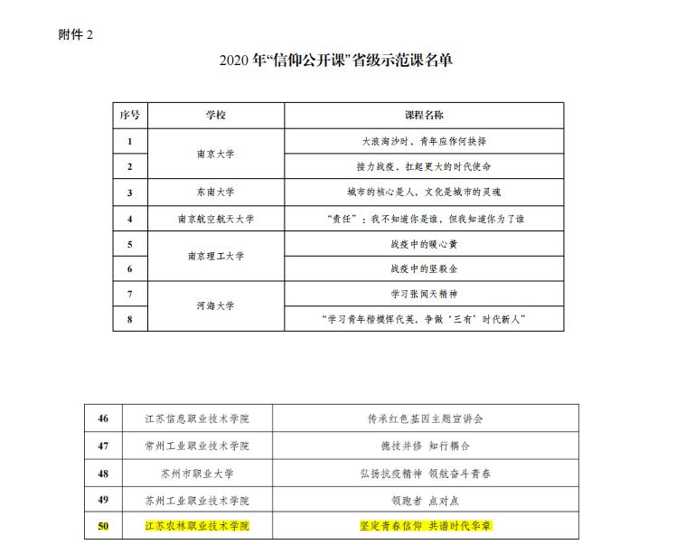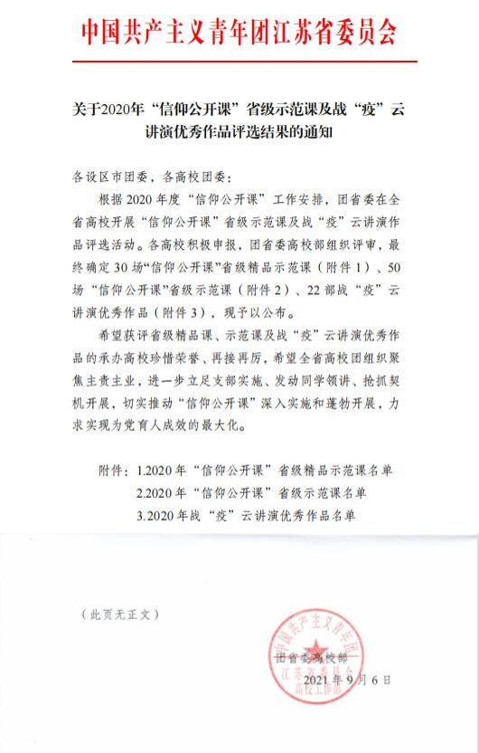 近日,共青团江苏省委公布了2020年全省高校“信仰公开课”省级示范课及战“疫”云讲演优秀作品评选结果,由FUN官网团委推荐、唐智老师主讲的“信仰公开课·新思想公开课”之《坚定青春信仰共谱时代华章》在全省报送作品中脱颖而出,获评省级示范课。