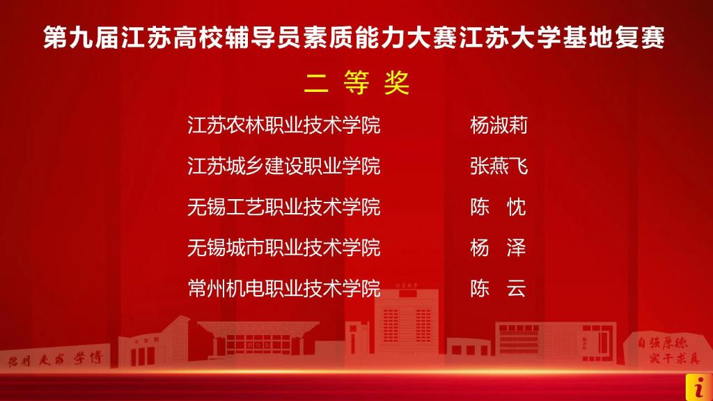 4月19日至20日,由中共江苏省委教育工委、江苏省教育厅主办,江苏省高等教育学会辅导员工作研究委员会、江苏省高校辅导员培训与研修基地(江苏大学)承办的第九届江苏高校辅导员素质能力大赛复赛通过线上的形式在腾讯会议和钉钉平台举行。来自镇江、常州、无锡三个地区高职高专院校的17名辅导员参加了此次复赛。