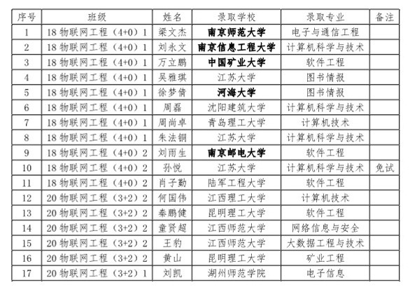 信息工程学院首届本科生18物联网工程(4+0)、20物联网工程(专转本)17名同学被省内外高校录取为硕士研究生,复试成功率100%。其中孙悦同学推免至江苏大学,梁文杰、万立鹏、刘雨生、徐梦倩、刘永文五位同学获得双一流院校研究生入学资格。