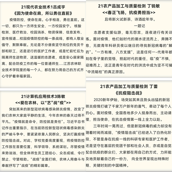 系列活动分为书法大赛、摄影大赛、绘画大赛和征文比赛四个类别,共有来自不同班级300余人参与到系列活动中。。面对当前疫情,翰墨农林书法社号召我校广大书法爱好者,用手中的笔墨助力疫情防控的宣传,创作出鼓舞气势,凝聚人心的正能量书法作品。在疫情面前,无数医护人员、志愿者、身边的老师和同学们,他们都挺身而出,为打赢这场疫情防控阻击战贡献着自己的一份力量。摄影爱好者用镜头记录了校园里真挚感人的战疫画面、美好的事物、校园美景等。来自不同班级同学用文字书写情感,记录下在这场战役中发生在自己身边最让你感动的人和事,或者记录下自己最难忘的经历和思考。绘画爱好者紧跟战“疫”号角,以“画笔”为枪,画出身边的战疫“英雄”、抗疫力量!