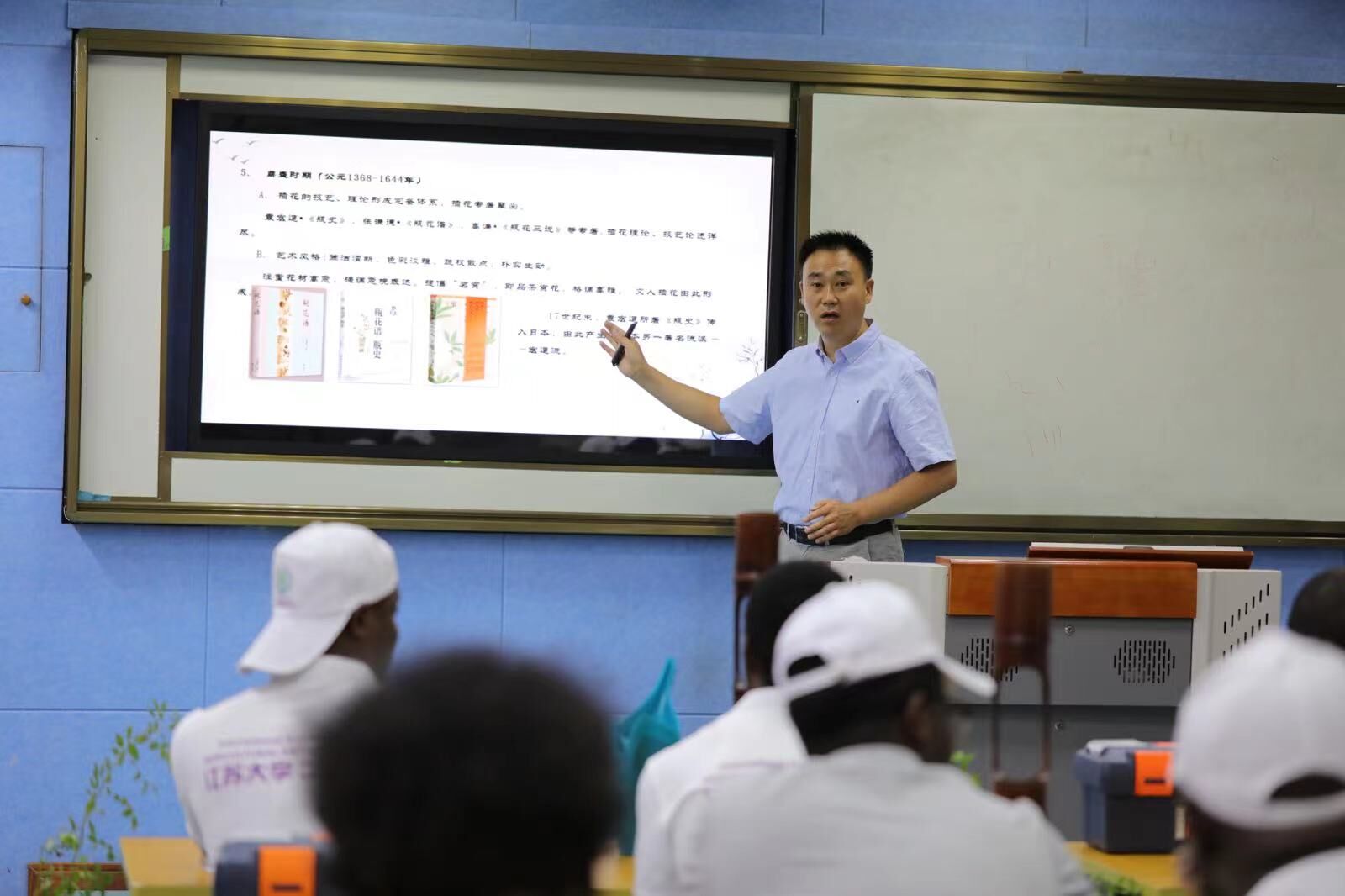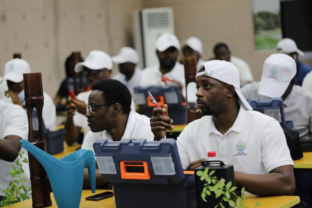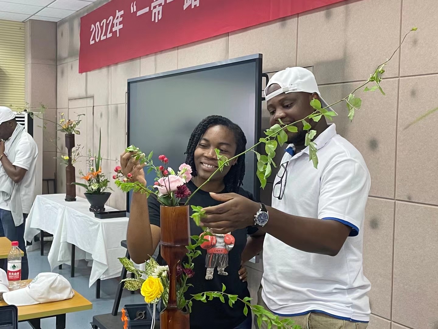 本次培训活动,面向教育部“中非友谊”农机使用及维修进修班及技术改进与创新进修班、农业部巴基斯坦—中国现代农业区域创新院农机培训班和2022年“丰收非洲”江苏大学农业机械化国际培训班等全体学员。培训中,江苏省技能大师张虎老师通过对中国传统插花基础、作品创作思路与方法、作品创作及作品鉴赏四个板块的讲授与实践,为学员们带来了一场精彩的文化盛宴。