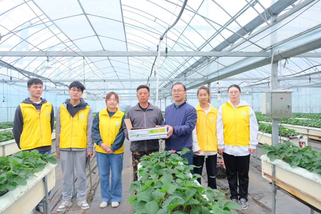 眼下正值草莓种植管理关键期,新禾助农服务团来到全国劳模纪荣喜的家庭农场进行了实地调查,王全智从设施草莓品种特性、省力化栽培意义、基质栽培技术要点等方面就草莓提质增效核心技术,给实践团成员进行了详细讲解分析,服务团还为纪荣喜家庭农场物化了生物农药等物质。全国劳模纪荣喜为同学们讲述了他从事草莓产业艰辛历程,他说:“我一生跟对了一个人——赵亚夫老师,一生中只做了一件事——种草莓,一生中做好一件事——把草莓种好”。他希望同学们要学好专业技能,把技术带回家乡,让技艺有承。服务团成员们认真记录并表示要发挥农科专业学生特长,扎根基层,助力乡村产业振兴。
