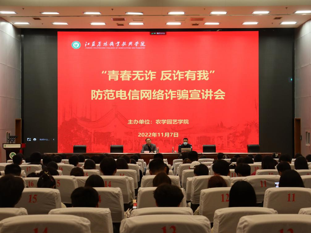 为广泛宣传防电信诈骗,提高学生对电信诈骗手法的识别和防范能力,11月7日晚7点,农学园艺学院联合句容市公安局在图书馆报告厅举办“青春无诈,反诈有我”防范电信网络诈骗宣讲会。本次宣讲会同时设立茅山校区、研发楼报告厅、腾讯视频三个分会场,1000余名学生参加。