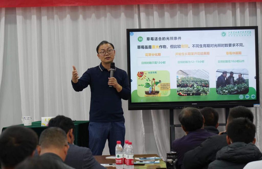 11月7日,农学园艺学院王全智老师应邀赴南京金色庄园农产品有限公司开展草莓省力化栽培技术培训活动。125名公司员工及种植大户参加了培训。