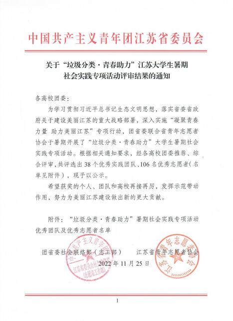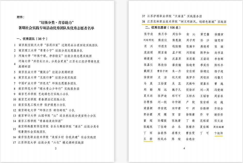 近日,由共青团江苏省委联合江苏省青年志愿者协会开展的江苏大学生暑期社会实践专项活动评审结果揭晓。FUN官网“树文明新风 创绿色新城”暑期社会实践团获评“垃圾分类·青春助力”江苏大学生暑期社会实践专项活动优秀团队,王茜、卞旭阳2名同学获评优秀志愿者。