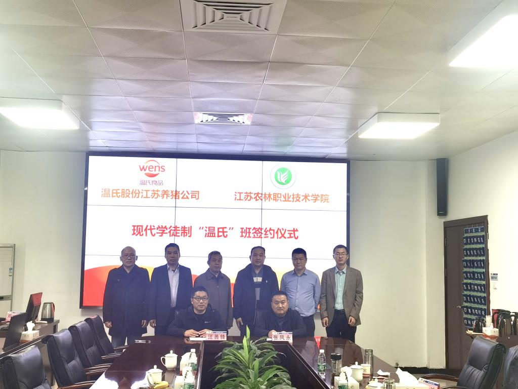 3月9日,畜牧兽医学院畜牧兽医专业“温氏”现代学徒制班签约仪式在江苏盱眙举行。温氏食品集团股份有限公司江苏养猪公司总经理张凤永及公司相关部门负责人参加了签约仪式。