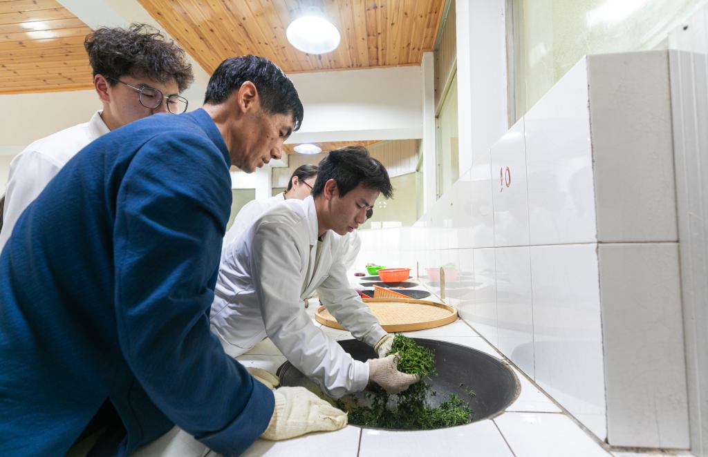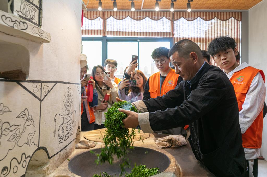 活动还组织学院师生深入碧螺春茶园、制茶基地,开展“工匠大师课”,邀请碧螺春制茶大师现场教学。授课现场,3位制茶导师轮番登场,从杀青、揉捻、搓团显豪到烘干,边炒茶边详细讲解碧螺春“柴火古法制茶”的技艺,手把手教师生们制茶。