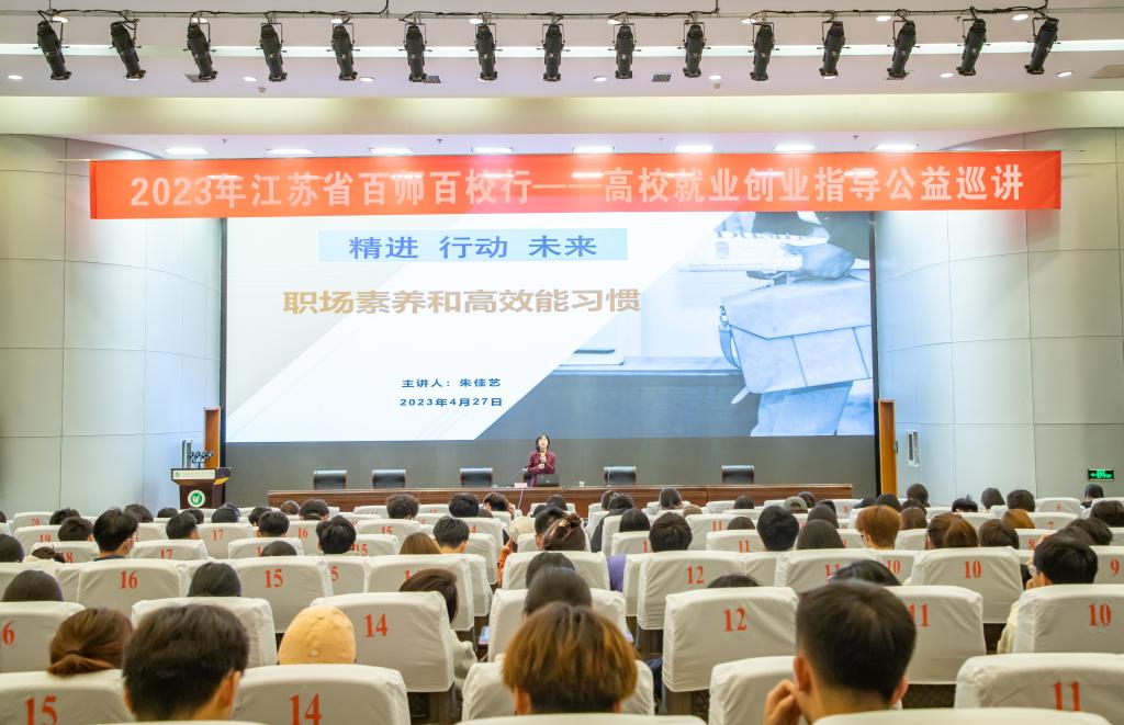 4月27日下午,江苏省2023年“百师百校行——高校就业创业指导公益巡讲”讲座在FUN官网图书馆报告厅举行。本次讲座由无锡职业技术学院就业指导中心主任朱佳艺讲授。