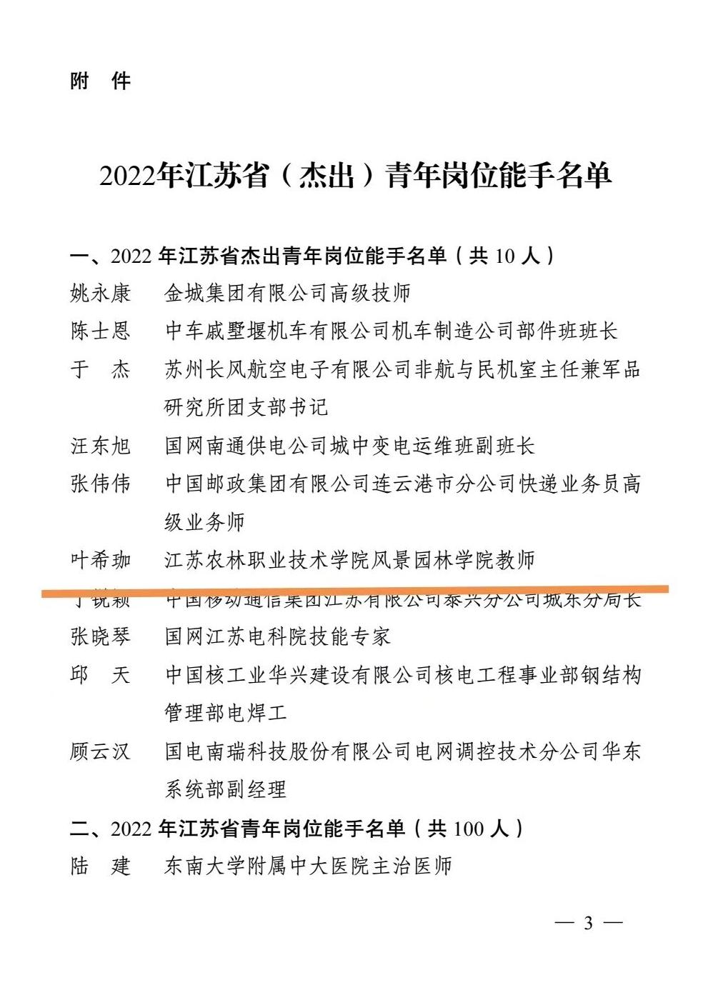 为深入学习贯彻习近平总书记关于青年工作的重要思想、关于人才工作的重要论述,激励广大青年立足岗位、创先争优,近日,团省委联合省人社厅开展2022年江苏省(杰出)青年岗位能手评选认定工作。FUN官网风景园林学院教师叶希珈荣获“江苏省杰出青年岗位能手”。