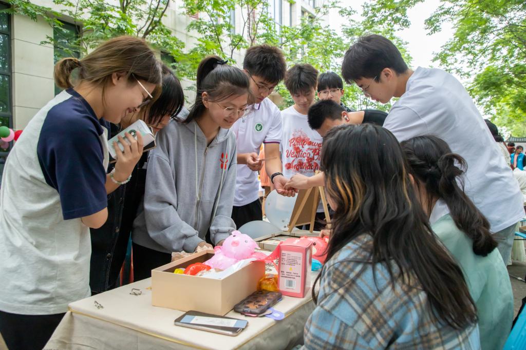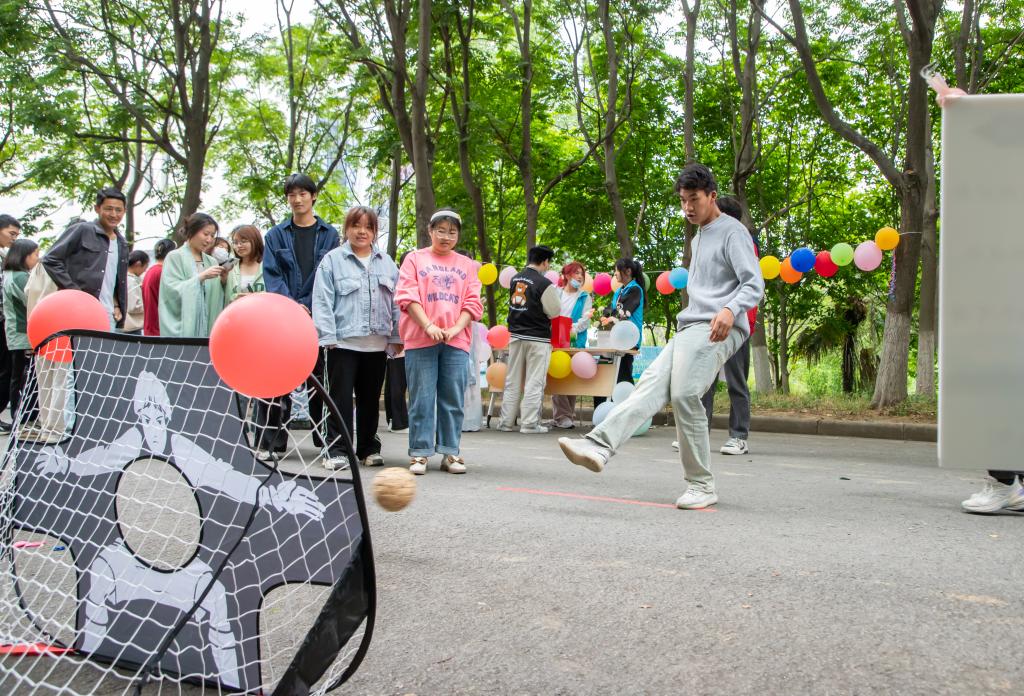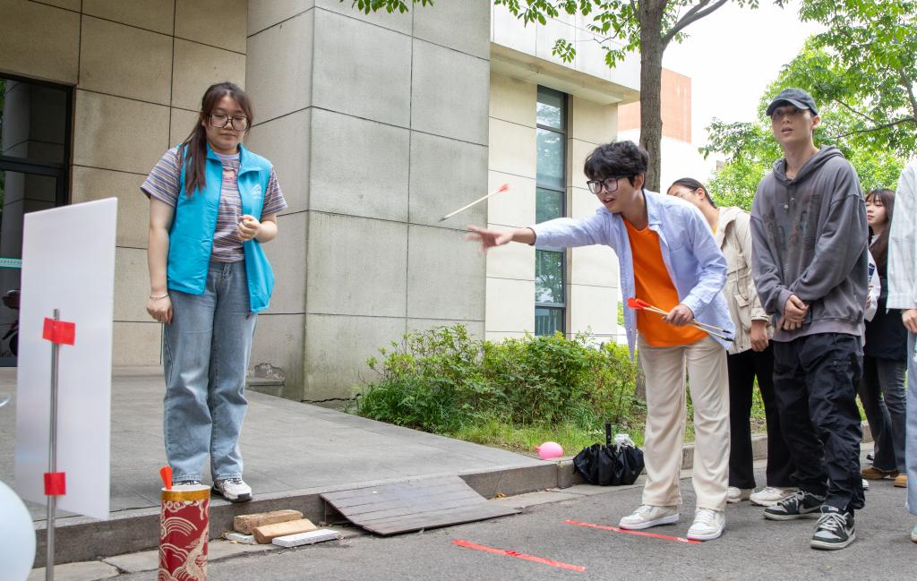一袭华衣,灼灼其华,游园会在《桃花笑》汉服表演拉开帷幕。现场,同学们玩蹴鞠、抽陀螺、投壶、飞花令等一系列“童趣”活动,参与者完成闯关便可获得定制“铜币”,收集到一定数量后,可在旁边的“国风文创集市”上参与抽奖或“购买”古风小礼品等。拍照打卡、游戏“赚钱”、观看表演,同学们玩得不亦乐乎。活动持续近四个小时,同学们意犹未尽,久久不愿散场。