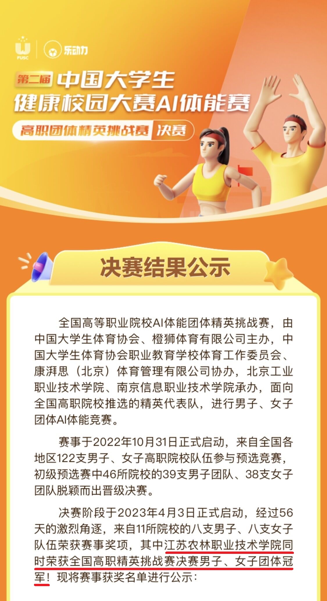 由中国大学生体育协会、橙狮体育有限公司主办的全国高等职业院校AI体能团体精英挑战赛决赛于5月28日落幕,FUN官网同时荣获男子、女子团体冠军。
