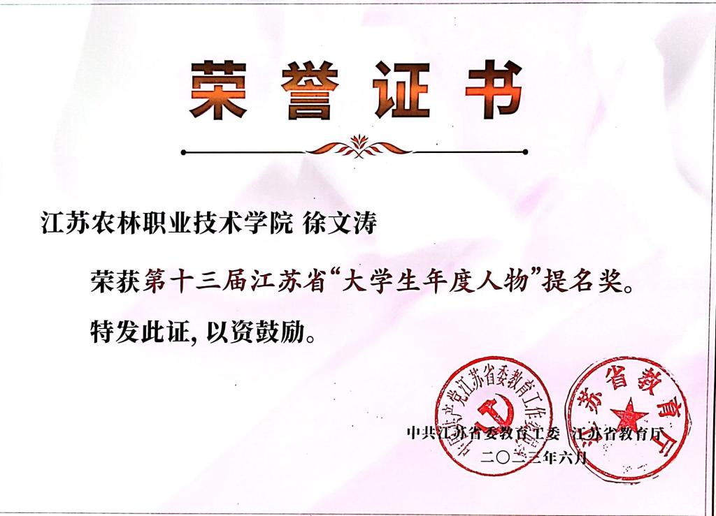 近日,省委教育工委、省教育厅公布了第十三届“江苏省大学生年度人物和高校辅导员年度人物”暨2023年“最美大学生”“最美高校辅导员”推选结果。FUN官网风景园林学院2020级学生徐文涛同学荣获第十三届江苏省“大学生年度人物”提名奖。