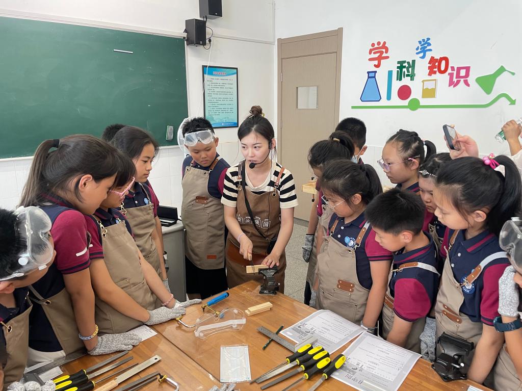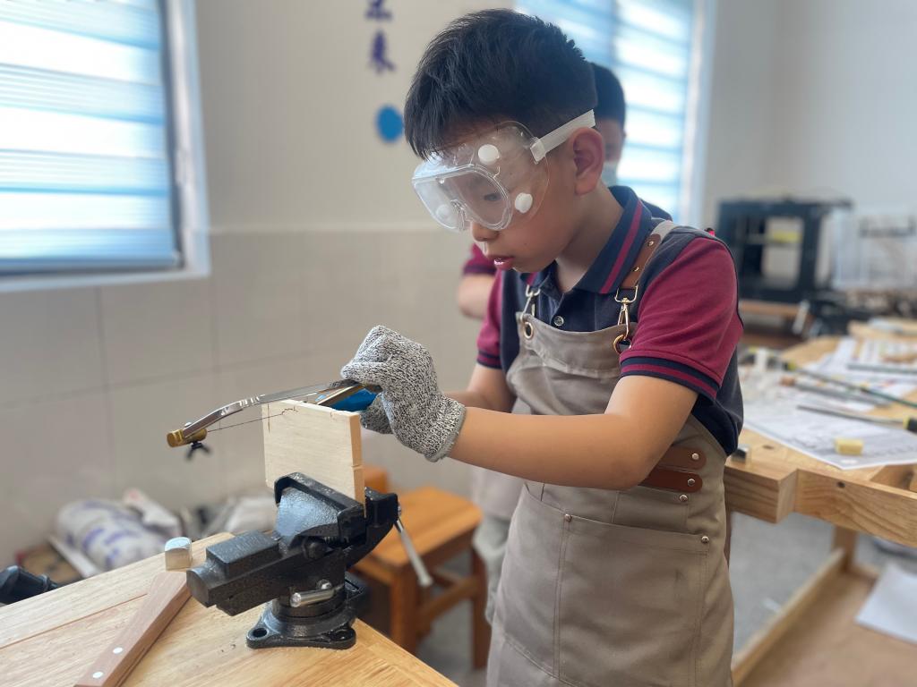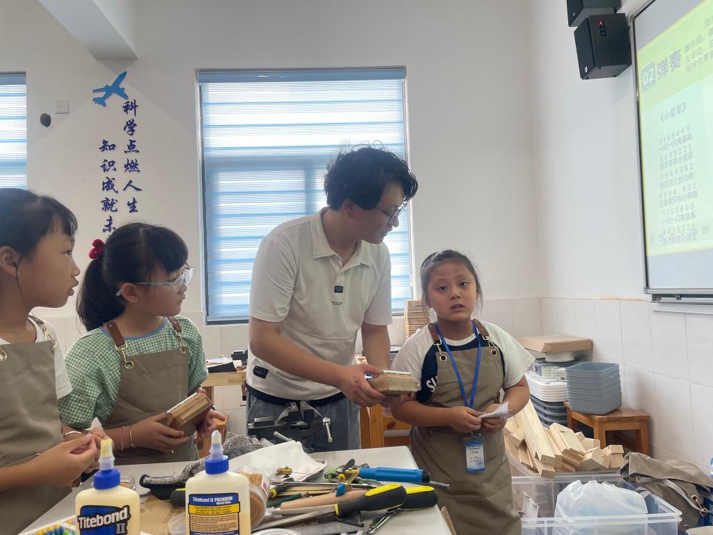 风景园林学院“梓匠工坊”的师生开设了丰富有趣的“匠心木艺课堂”,带来了造型书立架、百变积木小汽车、三通鲁班锁、掌心拇指琴等实践课。造型书立架课堂上,“全国技术能手”“江苏省五一劳动奖章”获得者叶希珈带同学们了解木工基础知识,欣赏木制品,认识常用木材、手工工具,初步掌握锯割、打磨等一些基本的木工加工方法。在掌心拇指琴课堂上,小学生们了解了拇指琴的种类,不同木材的特性和发音原理,学会琴谱并沉静在拇指琴弹奏的优美旋律之中。师生们带领学生在“玩-作-创”的木工活动中学习劳动技能、磨练劳动意志、体会“工匠精神”。来自四年级的姬又嘉在结业仪式上进行了课程体验分享,“我对三通鲁班锁很感兴趣,学习了制作它的基本程序,掌握拆解技巧,同时,我还学习到了鲁班精神,看起来好玩的小木头,但制作过程很辛苦,需要我们有吃苦耐劳、精益求精的精神来完成它。