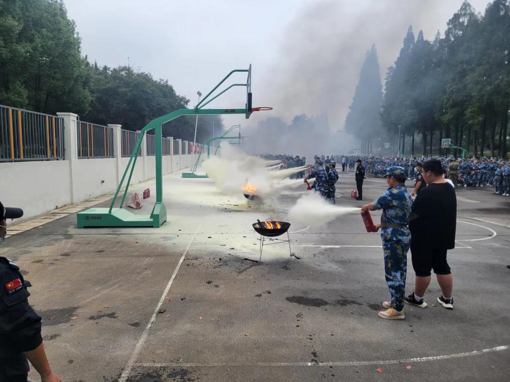 最后,消防大队培训教官向同学们详细介绍了消防基本知识和灭火器的使用方法与注意事项,并组织同学们分组进行灭火演练。