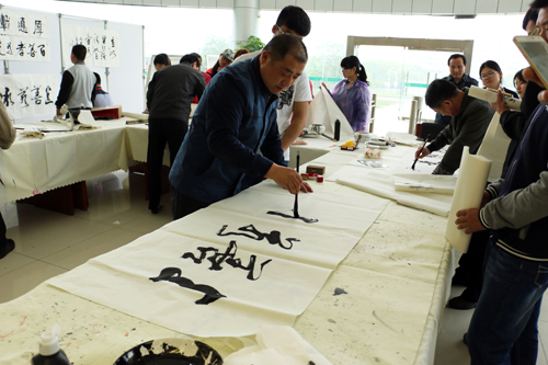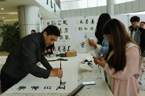 4月23日,“书香墨韵—书画名家与爱好者笔会”活动在学院图书馆二楼举行,这是学院第六届大学生读书节活动之一。 本次笔会特邀请句容市文联王宁、马久明、邵军等十位书画名家现场创作。观摩现场翰墨飘香、气氛热烈,书画家挥毫题书,共创作字画三十余幅。有的作品笔力苍劲、气势如虹、一气呵成,有的浓淡相映,有的疏密有致,有的隽永飘逸,在场的众人都沉浸在书画家们精湛的技艺和悠远的意境中。书法名家用中国传统文化的神韵,增强农林学院文化艺术素养,为第六届大学生读书节增光添彩。