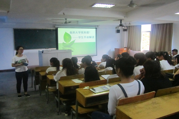经济管理系16级新生入学教育以“我的大学我知道--学生手册解读”为主题,系学工办老师用幽默风趣的语言就学生手册中的重点问题,如学生的权利和义务,说明学籍制度、学制等含义,解释考勤、请假、重读、重修、休学和复学等向同学们做了详细的解读。