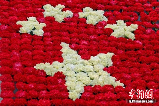下午5点,经过约2个小时的巧手精心拼织,一面特别的五星红旗拼成了。这面五星红旗用红色的康乃馨作“底色”、用黄色的康乃馨拼成“五角星”,看起来格外鲜艳。参与活动的同学纷纷表示,在祖国母亲67 岁生日来到之际,他们用康乃馨为她送上最深切的祝福,特别有意义。